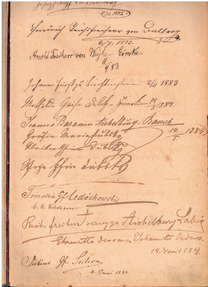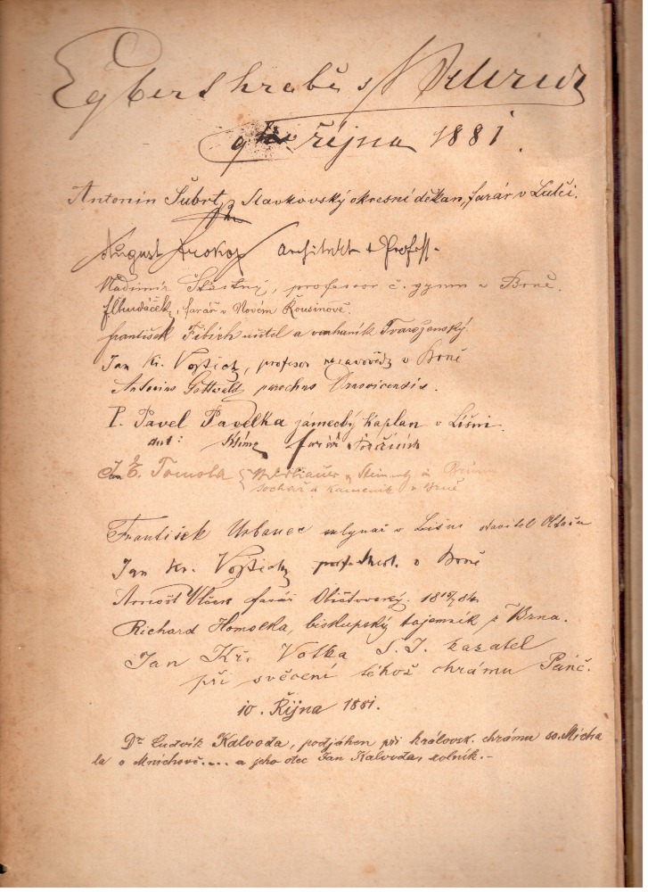 Podpisy účastníků slavnostního svěcení nového kostela sv. Mikuláše