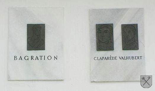 Na severní straně kaple Panny Marie Sněžné na Santonu jsou umítěny mramorové desky s bronzovými portréty důstojníků, kteří v Bitvě tří císařů veleli vojskům operujícím v okolí Santonu. Byl to ruský, respektive gruzínský, generálporučík kníže Petr Ivanovič Bagration (1765 – 1812), velitel předvoje spojenecké armády, francouzský generál Jean Maria Melon Roger Valhubert (1764-1805), smrtelně zraněný v bitvě a francouzský brigádní generál Michel Marie Claparede (1770–1842), velitel obrany Santonu. V roce 1984 byla na stěnu kaple umístěna podobizna generála Claparéda, portréty knížete Bagrationa a generála Valhuberta přibyly o dva roky později, v roce 1986. Autorem portrétů je tvaroženský výtvarník doc. Vladimír Drápal.