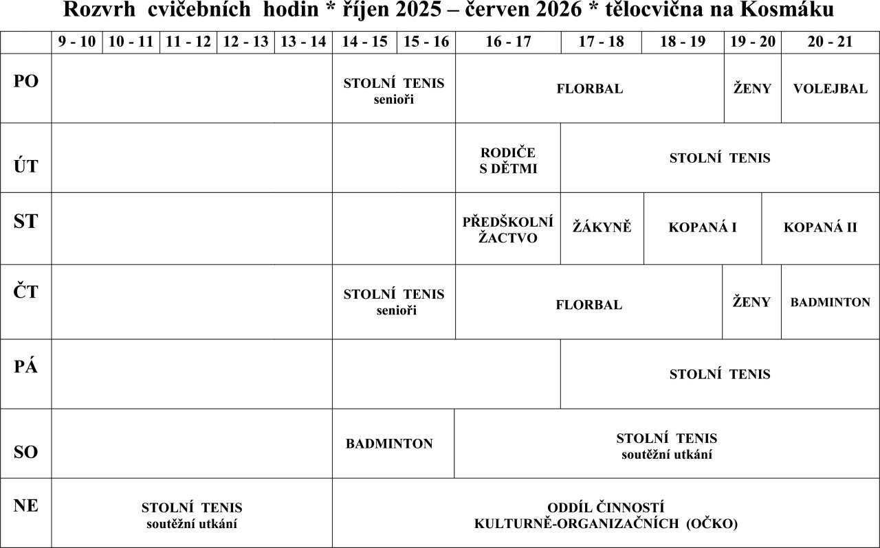 Rozvrh cvičebních hodin říjen 2025–červen 2026